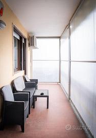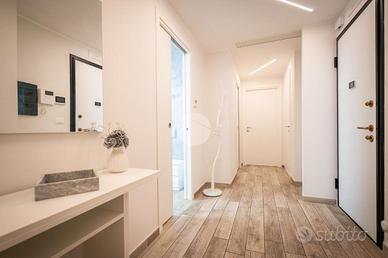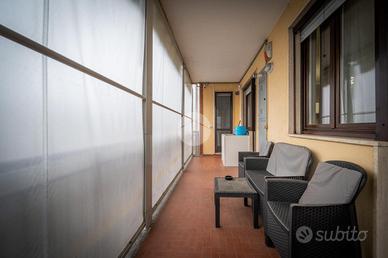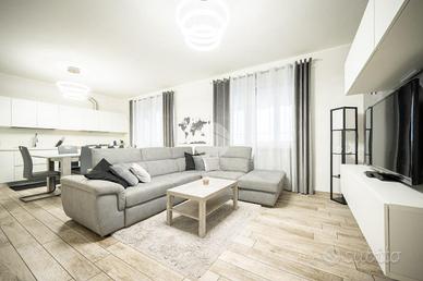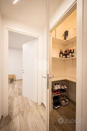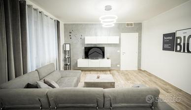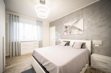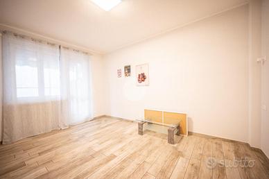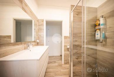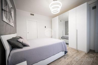 IMMOBILE ATTUALMENTE IN TRATTATIVA In zona residenziale, ma comodo alla zona centrale, l'appartamento si trova al piano rialzato di una palazzina in paramano. La soluzione internamente è stata totalmente ristrutturata. L'ampia e luminosa zona giorno è composta da un ambiente living con cucina a vista comodamente fruibile ed è dotata di due porte finestre con sfogo sul terrazzino munito sia di tenda invernale sia di tenda da sole. Le due camere da letto sono entrambe matrimoniali, una finestra l'altra con porta finestra. Dalla camera da letto patronale c'è l'accesso diretto al bagno con vasca, il quale è comunicante col secondo bagno, tramite porta scorrevole, dotato di doccia. E' presente il ripostiglio. Gli infissi sono in PVC con doppio vetro, il riscaldamento è centralizzato con termovalvole ed è presente l'impianto di condizionamento canalizzato. L'antifurto è perimetrale. L'immobile è libero da subito e viene venduto comprensivo di arredi come da distinta che verrà fornita in sede di appuntamento. Completano la soluzione la cantina e il box auto , fuori terra, che può ospitare un'auto.