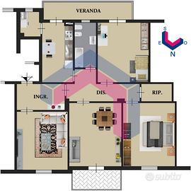 Composto da: Ingresso su saletta, salotto, cucina con veranda e lavanderia, 2 camere da letto, ripostiglio, servizio con doccia finestrato, balcone su prospetto.