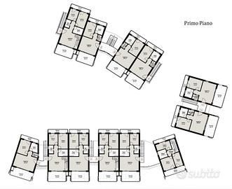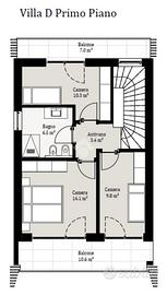 Al piano primo si trovano tre camere (una matrimoniale e due singole), un bagno con finestra e due balconi. Direttamente collegato alla casa il piano interrato ospita una taverna con lavanderia ed un garage doppio in larghezza separato dall'interrato del residence.
