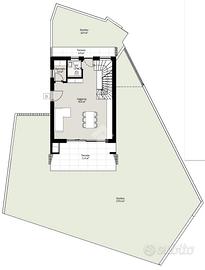 La villa è disposta su tre livelli: al piano terra si trova la zona giorno di oltre 40 mq con una grande porta-finestra affacciata sulla grande terrazza e sul giardino privato di oltre 250 mq, un bagno con finestra ed un pratico ripostiglio.