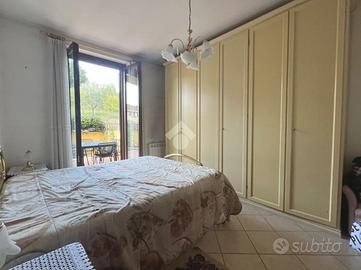 Dal giardino si accede direttamente al piano terra dove si sviluppa la zona giorno. Quì troviamo un soggiorno con porte finestre che affacciano sulla corte esterna e una cucina abitabile. Sullo stesso livello si trovano inoltre una camera matrimoniale anch'essa con accesso alla corte esterna, un bagno finestrato con doccia e un pratico ripostiglio.