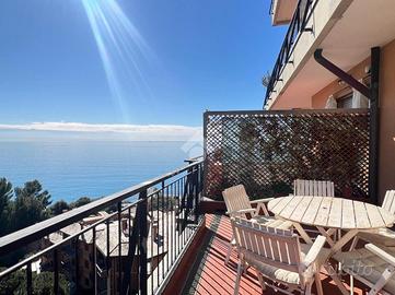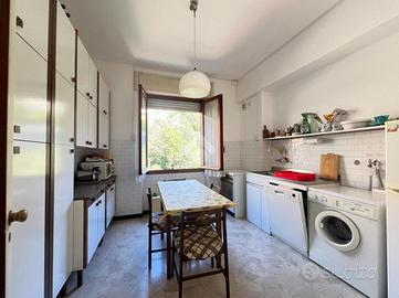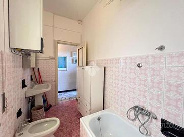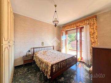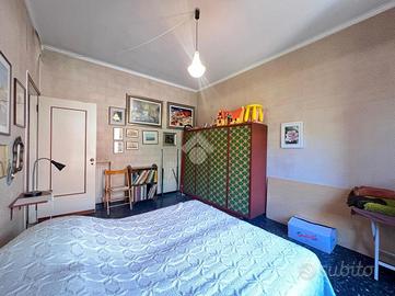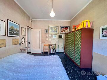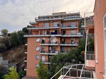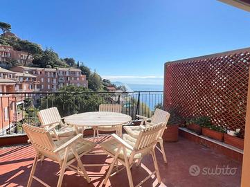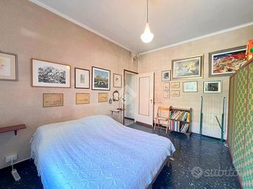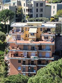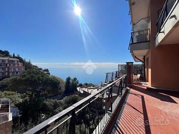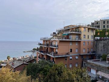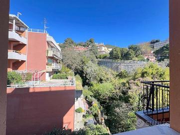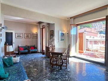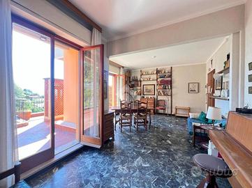 Arenzano - Via Unità d'Italia: a circa 500 metri dal mare proponiamo appartamento di ampia metratura con terrazzo vivibile al piano. Il palazzo in cui è ubicato l'immobile è molto particolare in quanto si sviluppa principalmente a scendere rispetto al piano portone. Appena entriamo in casa ci accoglie un salone doppio con due grandi porte finestra che ci conducono sulla terrazza al piano di circa 37 mq con una splendida vista mare; la cucina è abitabile ed attualmente è un vano separato dal soggiorno, ma all'occorenza sarebbe possibile creare un angolo cottura aperto sul salone e ricavare così una terza camera dal letto. La zona notte è dotata di due camere matrimoniali, un bagno finestrato con doccia e un ampia dispensa che potrebbe diventare un secondo bagno o una comoda lavanderia. Completano la proprietà un pratica cantina al piano e uno spazioso posto auto coperto di proprietà di circa 18 mq, all'interno di garage condominiale protetto da cancello automatico. Contesto silenzioso e tranquillo a pochi munuti dalla passeggiata e dal centro paese. Vista mare aperta e verso il verde circostante.