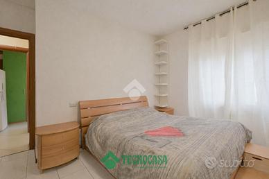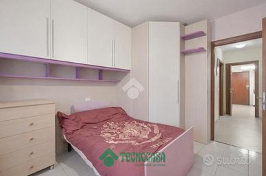 L'ingresso è direttamente nel soggiorno con cucina ad angolo in ambiente unico con accesso al terrazzino. Il disimpegno separa la zona giorno dalla zona notte, dove sono presenti un ripostiglio, due bagni, di cui uno finestrato con doccia e uno cieco; una camera matrimoniale e due camerette.