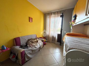 Attraverso un corridoio si accede alla zona notte, composta da una camera matrimoniale e una cameretta, entrambe con apertura sul balcone del prospetto secondario. Completano la soluzione due bagni, uno con vasca e l'altro con box doccia, oltre a due pratici e spaziosi ripostigli.