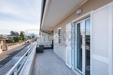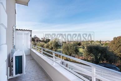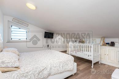 Al primo piano, si trova un ingresso, ampio salone, cucina abitabile, una camera matrimoniale e un bagno, il tutto con uscita su un balcone angolare con loggia, ideale per momenti di relax all'aperto. Al secondo piano, troviamo un'altra camera matrimoniale e due camerette di cui una con terrazzo ed un secondo bagno.
