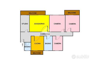 Entrando nell'appartamento troviamo un comodo soggiorno luminoso con accesso diretto su uno dei tre balconi, ideale per momenti di relax, una cucina abitabile, anch'essa con balcone, un pratico studio ed un primo bagno finestrato.