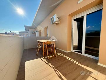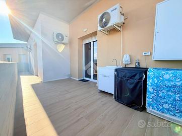 L'ingresso ci conduce all'ampia zona giorno composta da cucina, ripostiglio e soggiorno con accesso al terrazzo abitabile.
