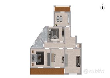 L'immobile si sviluppa come segue: ingresso, sala con accesso ad ampio balcone di 11mq, cucina abitabile con accesso alla veranda, tre camere da letto, due servizi finestrati con doccia, un ripostiglio, oltre a una cantina posta al piano seminterrato.