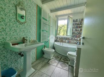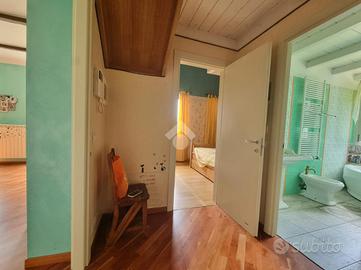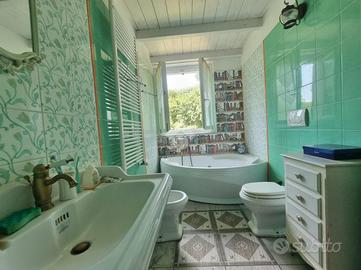 Il disimpegno conduce ai due bagni, uno finestrato arredato di vasca idromassaggio e l'altro cieco di servizio utilizzato anche come lavanderia.
