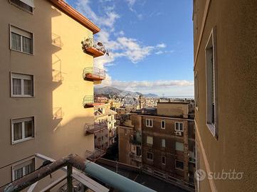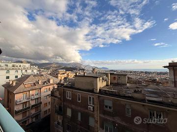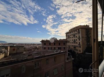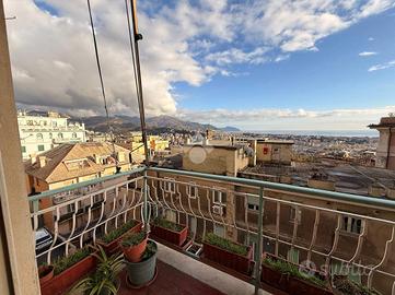 Varcando la soglia si viene accolti da ambienti ampi e luminosi, grazie alla favorevole esposizione sud-est che accompagna la casa per tutta la giornata. Il soggiorno si apre verso l'esterno attraverso uno dei due balconi, da cui lo sguardo si perde nel mare e nel cielo di Genova, regalando una sensazione di apertura e respiro difficile da trovare in città.