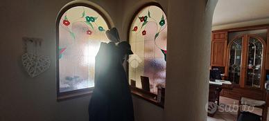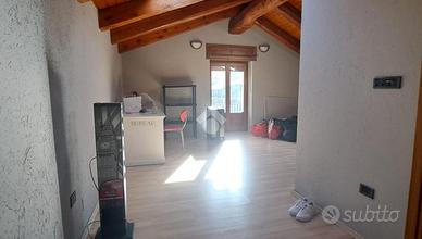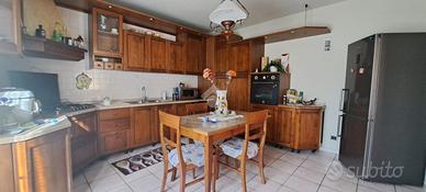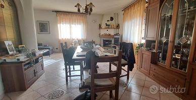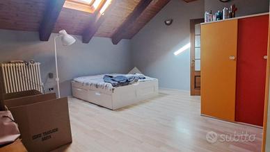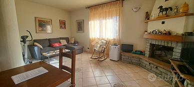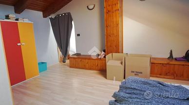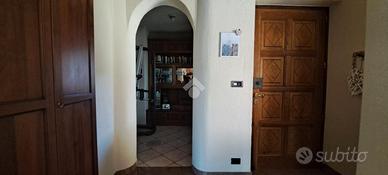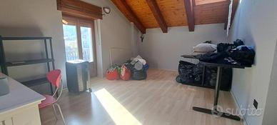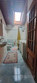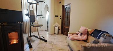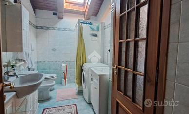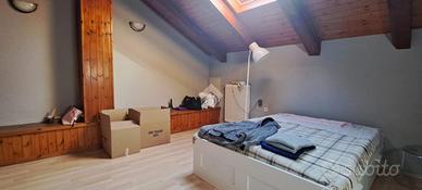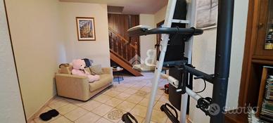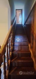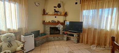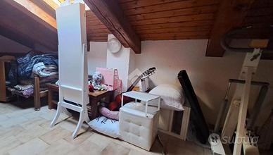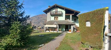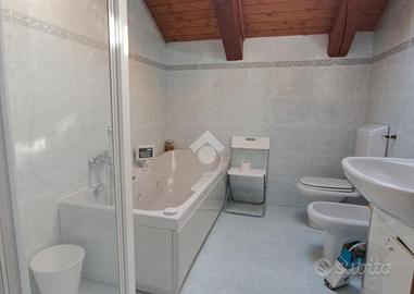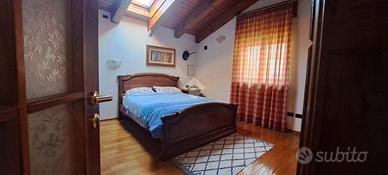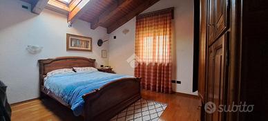 L'ingresso è protetto da cancello automatizzato, l'ampia area verde è divisa equamente tra due diverse abitazioni, la porzione in oggetto presenta un ingresso pedonale dal piano terreno con comoda scala esterna coperta e terrazzo vivibile con vista, ingresso principale con ampio disimpegno e vetrata artistica, cucina abitabile con balcone su tutto il lato ovest della casa con splendida vista sulle montagne, salone con caminetto a legna, ci sono poi uno studio-palestra con ripostiglio, la camera matrimoniale di generose dimensioni ed un ampio bagno finestrato dotato di comoda doccia. Salendo al secondo troviamo 2 ampie camere con tetto a vista, un balcone con affaccio a sud, un bagno completo dotato di vasca idromassaggio e velux ed un sottotetto ad uso cabina armadio a sfruttare le parti basse.