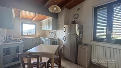 La cucina abitabile, completamente separata e dotata di doppie finestre, si apre su una grande veranda e su un terrazzo abitabile di generose dimensioni, perfetto per pranzi e cene all'esterno e vista panoramica e vista mare.