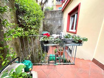 Facciamo il nostro ingresso dal cancello che da sullo sfogo esterno privato: una corte pavimentata di 20mq circa, adornata da piante in fiore, e disposta su due livelli connessi da scaletta.