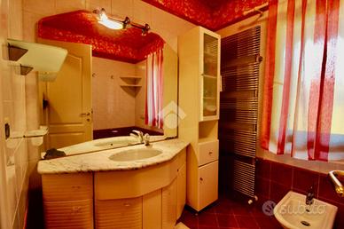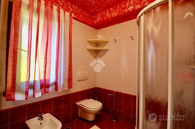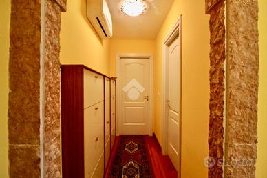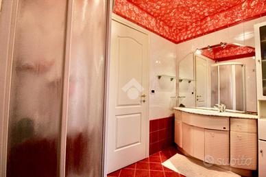 Sulla sinistra troviamo il secondo arco, e dopo aver percorso alcuni passi nel disbrigo, sulla destra, accediamo al bagno finestrato, completo di tutti i sanitari e doccia angolare.