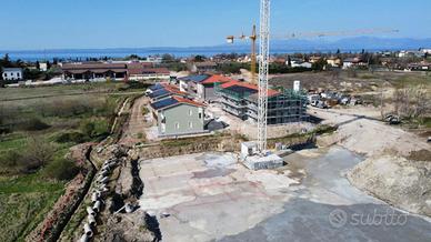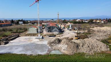 NUOVA COSTRUZIONE A LAZISE IN ZONA RESIDENZIALE A 1 KM DAL PAESE, QUADRIFAMIGLIARI COMPOSTE DA APPARTAMENTI TRILOCALI E PENTALOCALI CON 2 BAGNI. GIARDINI ANGOLARI DI PROPRIETA' O AMPIE TERRAZZE COPERTE. Gli appartamenti sono già in costruzione in tranquilla e nuova zona residenziale a 1 chilometro dal centro di Lazise. Gli alloggi spazieranno dai trilocali con doppi servizi ai pentalocali (3 CAMERE DA LETTO, SOGGIORNO, CUCINA ABITABILE, 2 BAGNI), impreziositi da ampi giardini privati o ampie terrazze per le soluzioni ai piani primi. Tutte le soluzioni abitative avranno garage al piano interrato, cantina e saranno servite da ascensore condominiale; inoltre saranno previsti l'impianto di riscaldamento a pavimento con pompa di calore ad alta efficienza e impianto fotovoltaico autonomo da 3,5 Kw per ogni unità, atti a garantire il risparmio energetico e il benessere abitativo. N.B. I mq indicati sono computati secondo la L.R. 42/1999.