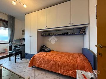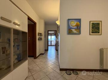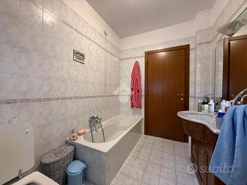 L'ingresso è nel disimpegno che da una parte affaccia nel grande soggiorno e dall'altra ci porta in corridio dove troviamo subito la cucina abitabile con balcone. Proseguendo per il corridoio abbiamo il primo bagno con doccia, due camerette singole entrambe con accesso a un secondo balcone, camera matrimoniale e il secondo bagno con vasca. Completa l'immobile un ampio garage, all'interno dell'area condominiale sono presenti posti auto non assegnati.