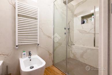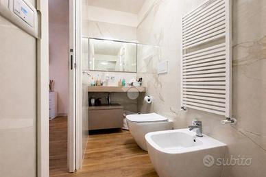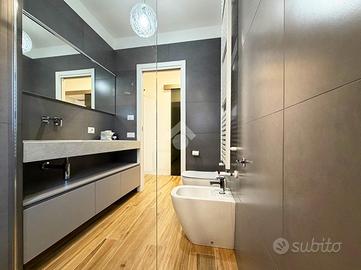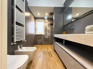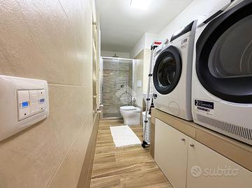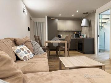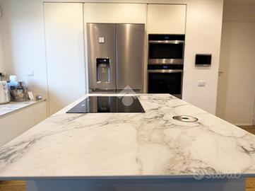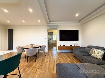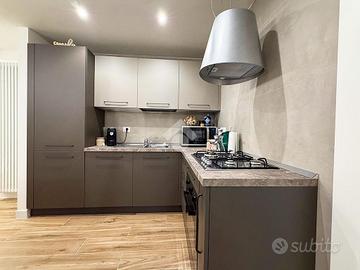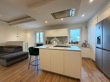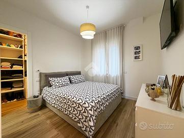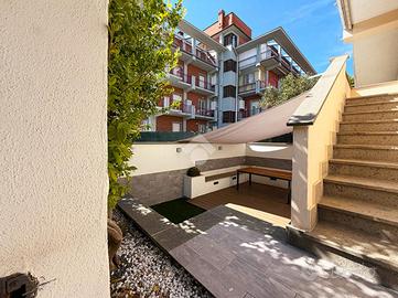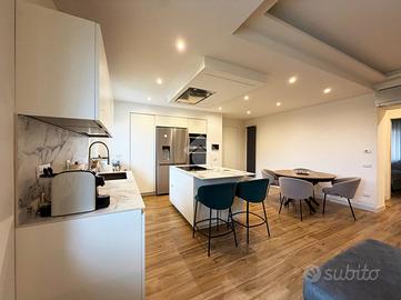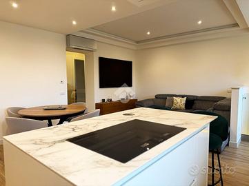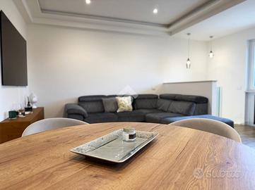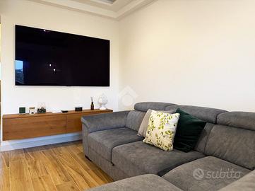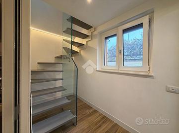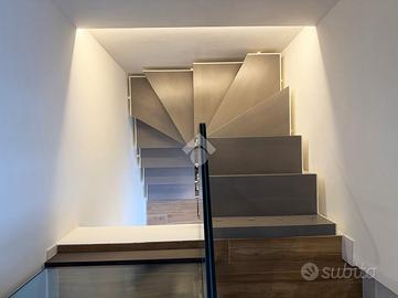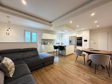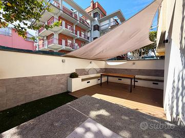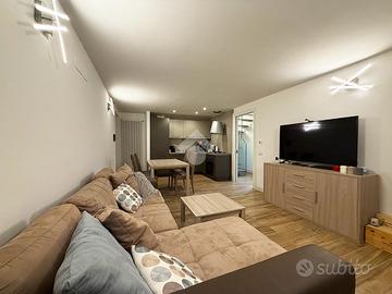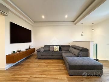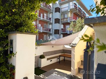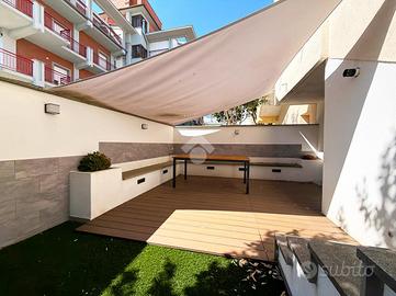 Eleganza contemporanea, tecnologia e comfort nel cuore di Montalto. In una delle zone più ricercate, in Via Giulio Cesare, di fronte ai giardini pubblici e a pochi passi dal viale principale, proponiamo in vendita un'abitazione di design in un contesto riservato di sole quattro unità. L'immobile si sviluppa su due livelli, collegati da una scenografica scala con parapetti in vetro e pedate in legno, elemento distintivo dello spazio. Zona giorno - design e funzionalità (circa 40 mq) Al piano terra rialzato si apre una luminosa zona living open space. La cucina contemporanea presenta una penisola in marmo con cappa a soffitto integrata. Le armadiature su misura ottimizzano gli spazi mantenendo linee essenziali. Completano l'ambiente una zona relax, area pranzo, illuminazione studiata e pavimento effetto legno. Zona notte - privacy e comfort Separata da porta scorrevole in vetro fumé, comprende: * Camera matrimoniale (14 mq) con cabina armadio (5 mq) e bagno en suite (4 mq) * Seconda camera (14 mq), luminosa e versatile * Bagno finestrato con doccia walk-in, seduta integrata e illuminazione modernaPiano seminterrato - spazio e versatilità Ambiente di circa 30 mq ideale come taverna o seconda zona living, con camino, seconda cucina e bagno finestrato (5 mq). Accesso diretto all'area esterna e al garage di 18 mq con ingresso indipendente. Area esterna - oasi privata Spazio curato per relax e convivialità: pedana in decking con zona pranzo, seduta in muratura, vela ombreggiante e inserti di verde sintetico. Un ambiente elegante, riservato e a bassa manutenzione. Tecnologia, sicurezza e comfort Sistema domotico per controllo luci, termosifoni e persiane siada remoto che con l'utilizzo della voce. Dotazioni: infissi in PVC triplo vetro a tripla apertura, persiane elettriche, portone blindato e grate di sicurezza. Climatizzazione con impianti Mitsubishi (zona giorno e camera), predisposizione per altri ambienti. Sicurezza completa con allarme e videosorv