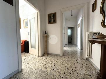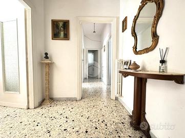 L'appartamento si distingue per la sua tripla esposizione che garantisce una notevole luminosità in tutti gli ambienti, grazie alla presenza di balconi e finestre distribuiti sui tre lati. L'attuale disposizione interna prevede un soggiorno doppio, una cucina, quattro camere da letto e un bagno, con la possibilità di realizzare un secondo servizio.