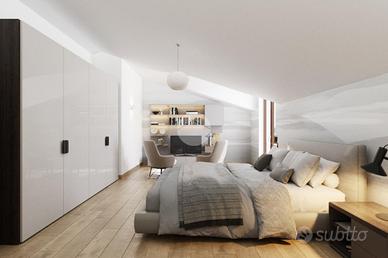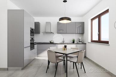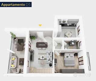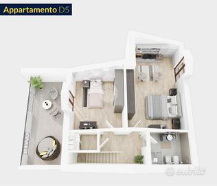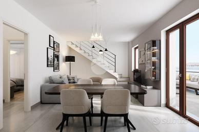 Il portoncino blindato apre sull'ampio soggiorno con affaccio sul terrazzo privato. La cucina abitabile risulta in ambiente separato. Il disimpegno conduce al bagno finestrato ed alla camera da letto con balcone presente al piano. La scala interna conduce al piano superiore di ampia metratura dove sono presenti 2 ulteriori camere da letto di cui una con terrazzo privato e l'altra con cabina armadio. Al piano è presente un ulteriore bagno e un ripostiglio/lavanderia. A completare la soluzione vi è la cantina di pertinenza.