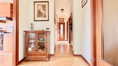 All'ultimo piano di una palazzina di soli tre livelli, edificata a metà degli anni '80, è disponibile un appartamento che si distingue per la solidità della costruzione e la funzionalità degli spazi. L'edificio, realizzato con facciate in mattoni a vista e tetto in cemento armato, non ha mai richiesto interventi strutturali importanti, garantendo così una notevole riduzione dei costi legati a lavori straordinari. L'ingresso mediante porta blindata introduce a un ambiente accogliente e ben distribuito. La cucina si affaccia su un balcone riservato, mentre il soggiorno gode dell'accesso diretto a un ampio terrazzo, condiviso con una stanza adiacente, ideale come studio o zona relax. La zona notte ospita due camere da letto e doppi servizi, uno con vasca e l'altro con box doccia, offrendo comfort e praticità per tutta la famiglia. L'appartamento è dotato di serramenti in legno con vetrocamera, che garantiscono un buon isolamento termico e acustico, e di riscaldamento termoautonomo, che consente una gestione efficiente dei consumi. Completano la proprietà una cantina e un box auto, inclusi nelle pertinenze. Una soluzione ideale per chi cerca tranquillità, ultimo piano e un contesto edilizio di qualità.