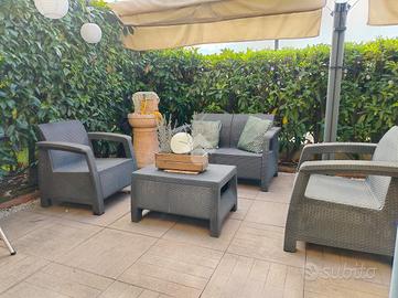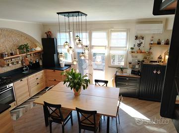 Proponiamo porzione di villa a schiera dotata di riscaldamento a pavimento e così composta : ingresso con una spaziosa e luminosa zona giorno di ben 70 mq.