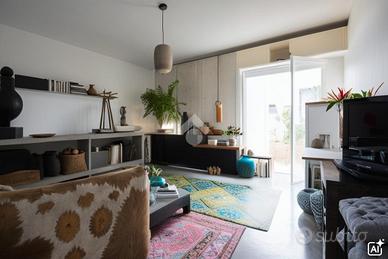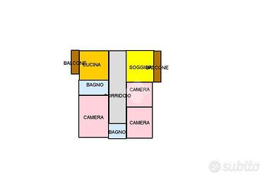 L'ingresso, posto in un ampio corridoio, permette di accedere a tutti gli ambienti. La zona giorno è composta da una cucina abitabile, separata da un ampio soggiorno, entrambi con accesso diretto al balcone.
