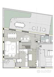 L'ingresso si apre su un'ampia zona living con accesso a un grande terrazzo privato e verandato. La cucina, separata e di generose dimensioni, dispone di un proprio terrazzino. Sullo stesso livello si trovano inoltre uno studio e un comodo ripostiglio.