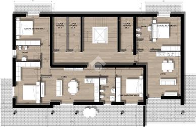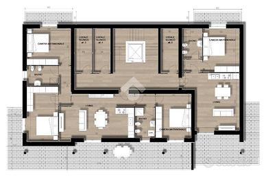 L'alloggio è disposto su piano unico: l'ingresso si apre sulla luminosa e ampia zona giorno suddivisa in un comodo salotto per trascorrere momenti di relax e una cucina abitabile a vista con sfogo sull'ampio terrazzo di circa 50 mq. Il disimpegno conduce alla zona notte composta dalle tre camere da letto e da due bagni finestrati.