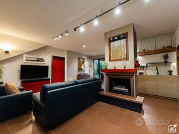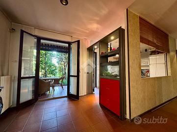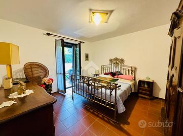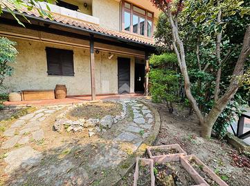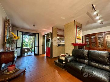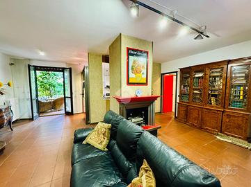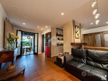 L'ingresso principale conduce direttamente nel soggiorno, caratterizzato da un camino e da cucina abitabile. Entrambi gli ambienti godono di accesso diretto al giardino, completamente esposto a sud, tramite porte finestre, permettendo di godere appieno della luce naturale e della vista sul verde circostante.