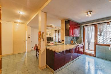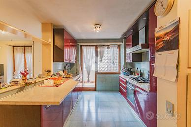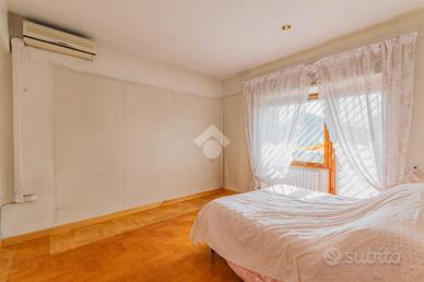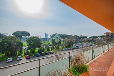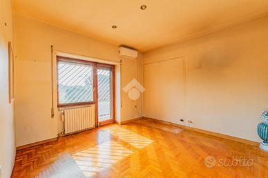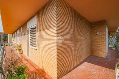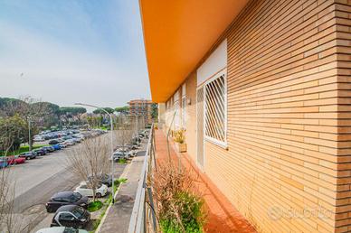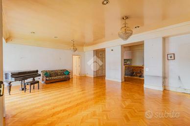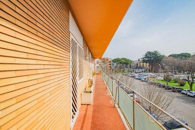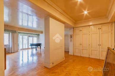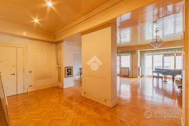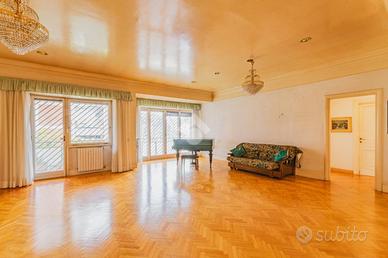 E. U. R. CENTRO - VIALE DEI PRIMATI SPORTIVI APPARTAMENTO SIGNORILE CON BOX AUTO All'interno del Pentagono dell' E. U. R in una delle vie più riservate e silenziose del quartiere, precisamente in Viale dei Primati Sportivi, proponiamo in vendita esclusiva un ampio appartamento sito al secondo piano che si sviluppa su una base quadrata con triplice esposizione (EST-SUD-OVEST). Completa la proprietà un box auto di 22 mq compreso nel prezzo. Il garage in questione è sito all'interno della stessa palazzina, collegato tramite ascensore e dotato di spazi adiacenti che ne consentono l'utilizzo con manovre estremamente semplici. La soluzione si trova all'interno di un'elegante palazzina in cortina di soli quattro piani che ha ricevuto una recente ristrutturazione per le facciate e per il lastrico solare. Lo stabile in questione non ha mai avuto criticità a livello statico. L'appartamento è composto da due ingressi, entrambi con porta blindata. L'ingresso principale consente di accedere ad un salone di rappresentanza che misura circa 70 mq, si sviluppa su base rettangolare ed è dotato di porte finestre che consentono l'accesso al terrazzo abitabile che lo costeggia (tra i tanti aneddoti sulla casa si racconta che questo salone per le sue generosissime dimensioni abbia ospitato cene per oltre 50 persone e sia stato anche teatro di partite di pallavolo). Dall'ingresso secondario si accede alla cucina a vista con un ampio tinello adiacente, anche questa parte della casa è dotata di porte finestre che consentono l'utilizzo di un altro terrazzo abitabile. Sia dal salone che dalla zona di servizio vi è la possibilità di accedere alla zona notte, che rimane separata dal resto della casa e che vanta tre camere da letto matrimoniali intramezzate da due grandi bagni finestrati con antistante disimpegno. Tutte le stanze hanno accesso al terrazzo ad elle che costeggia il salone e si sviluppa anche per tutto il perimetro della zona notte per più di 30 m.