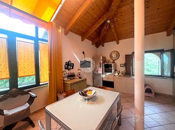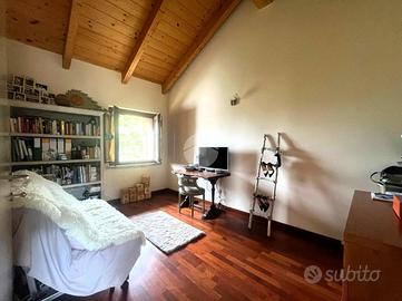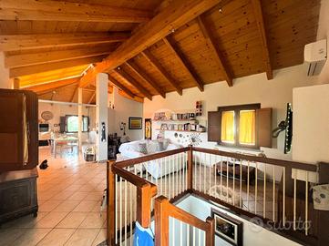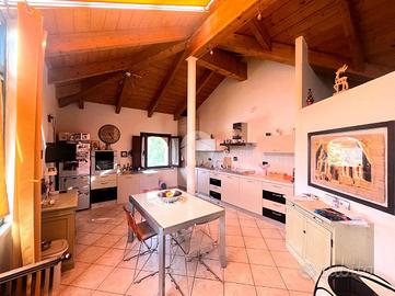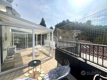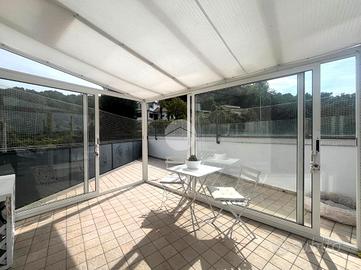 Una comoda scala modulare in legno conduce poi alla luminosa sala con accesso tramite porta finestrata all'ampio terrazzo provvisto di veranda, che permette di poterne godere non solo nelle giornate estive ma anche in quelle più fresche o di pioggia.
