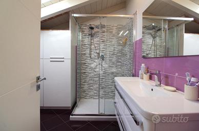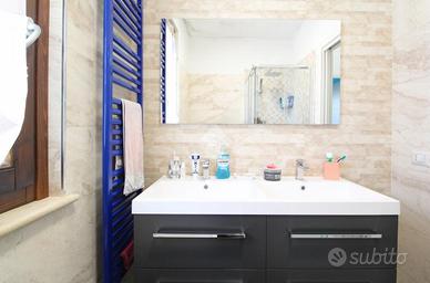 Proseguendo al piano superiore si accede alla seconda abitazione, il cuore della casa principale: il grande soggiorno con cucina open space accoglie con eleganza e proporzioni generose. Da qui si raggiunge un terrazzo chiuso e rifinito come secondo ambiente cucina, un valore aggiunto per chi ama spazi versatili e ben organizzati. Sullo stesso livello è presente anche un bagno di servizio.