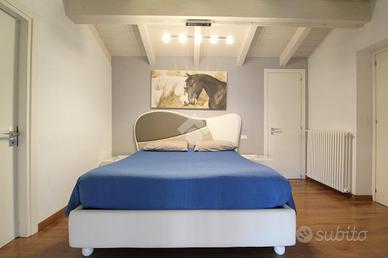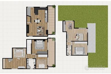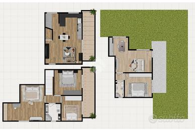 La prima unità, situata al piano terra, si apre su un ambiente open space dedicato alla zona giorno, collegato con naturale continuità alla camera matrimoniale e al bagno. Il giardino privato e il posto auto completano questo livello, garantendo autonomia e praticità, perfetti anche per chi desidera mantenere separati gli spazi abitativi.