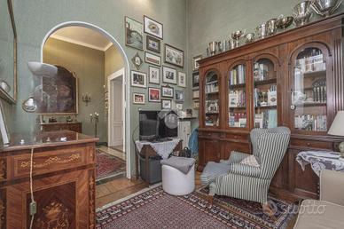 L'alloggio, dotato di videocitofono e antifurto, si apre su un grande disimpegno che conduce agli ambienti principali dell'abitazione. Da qui si accede direttamente al doppio soggiorno, un ambiente incantevole con soffitti imponenti e dettagli originali dell'Ottocento.