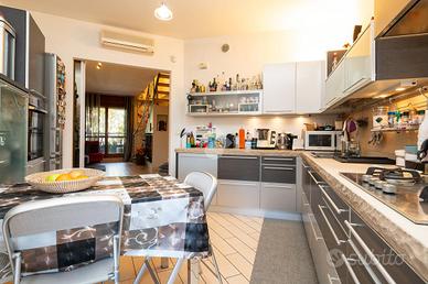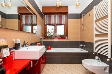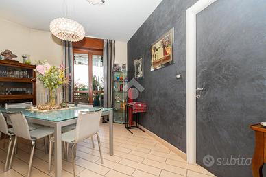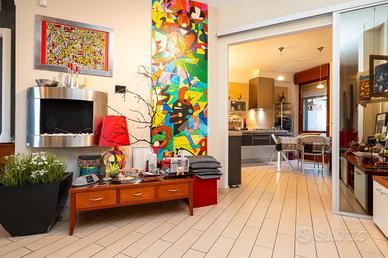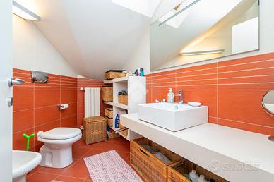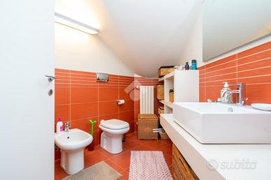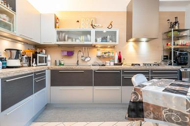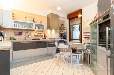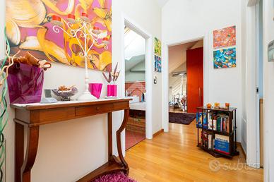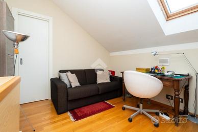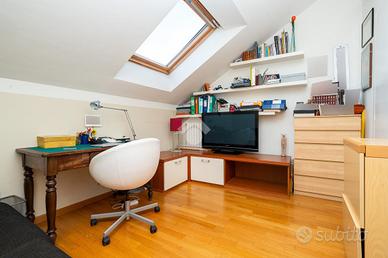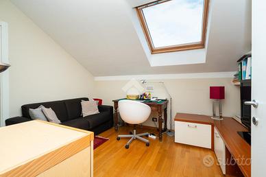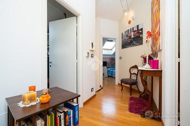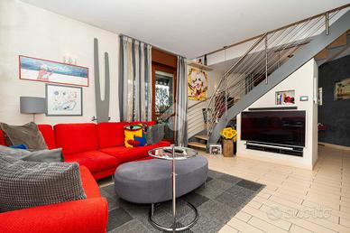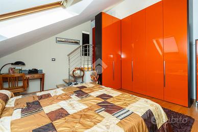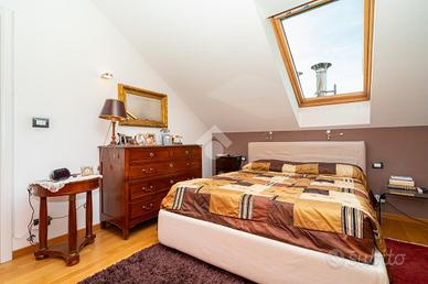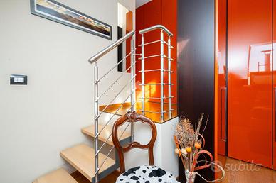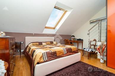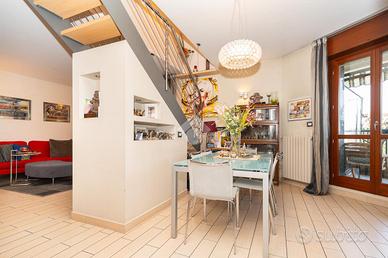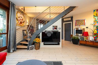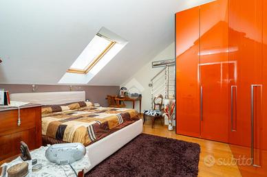 VIA SANT'AMBROGIO. In palazzina signorile del 2006 priva di barriere architettoniche presentiamo splendido bi-livello ultimo piano di ampia metratura. L'alloggio è caratterizzato da un doppio salone living con al centro la scala che ci conduce alla zona notte e che divide l'area relax dalla zona pranzo. La cucina abitabile è dotata di balcone interno cortile ed ha una doppia porta a mantovana esterna che ci consente di vivere l'intera zona giorno come fosse un unico ambiente. A completare il piano abitativo troviamo un bagno finestrato ed un angolo lavanderia. Dalla scala in acciaio e legno si raggiunge il piano mansardato composto da tre camere e bagno. Tutti gli ambienti sono dotati di ampi venux con oscuranti elettrici. A completare la proprietà troviamo, oltre alla cantina di pertinenza, un box auto doppio completamente soppalcato con sezionale elettrico ed un posto auto all'interno del cortile a piano strada. Autorimessa e posto auto sono da acquistare a parte ad euro 65mila.