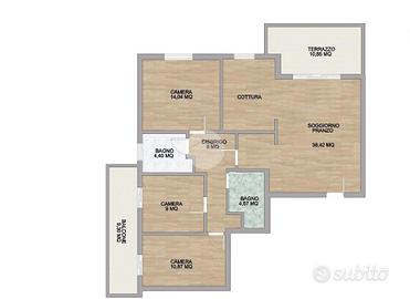 Dal soggiorno si accede a un comodo disimpegno che conduce alla zona notte composta da tre camere da letto, di cui una con finestra e due con porte finestra con accesso sul balcone. Sono presenti due bagni, di cui uno finestrato.