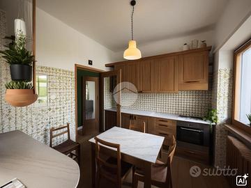 Accanto è posizionata la cucina abitabile con finestra sul balcone. Da qui un corridoio ci conduce alla zona notte caratterizzata da 3 camere da letto, due bagni e un ripostiglio/zona lavanderia.