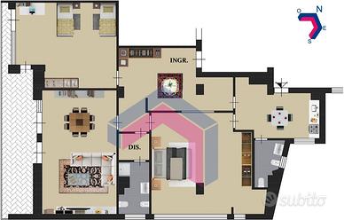 L'appartamento è composto da: Doppio ingresso, salone doppio, cucinotto, 2 camere da letto (una pari a due vani), doppi servizi finestrati, disimpegni, ampio balcone panoramico di 18 mq.