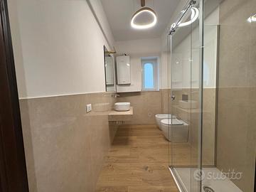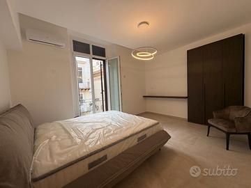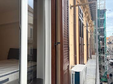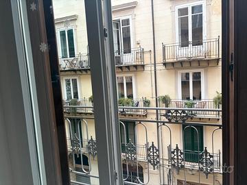L'appartamento dispone di un doppio ingresso, di un ampio salone doppio, in parte impreziosito da travi in legno a vista, e di una cucina semiabitabile. Dal salone e da una delle camere si accede al balcone con affaccio su Corso Vittorio Emanuele. La zona notte è composta da due camere da letto e da due bagni, entrambi con doccia, moderni e funzionali. Un elegante soppalco abitabile, collegato al salone, può essere utilizzato come studio o come terza camera.