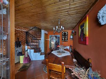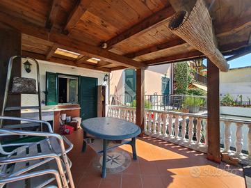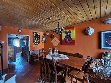 Al piano terra è presente la zona giorno con salotto, cucina abitabile dove è presente il termocamino e ampia terrazza attrezzata con portico in legno.