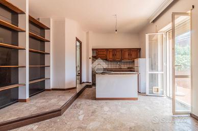 Dall'ingresso ci accoglie l'appartamento principale con un disimpegno che collega i vari ambienti della casa: a destra l'ampio salone con angolo cottura illuminato da sud-est con apertura verso il terrazzo privato, oltre il salone si ha la porta della camera padronale affacciata a nord-est. A sinistra dell'ingresso si ha un locale aperto e versatile adibito a studio in fondo al quale si arriva al primo bagno con doccia e valvola di aspirazione. Di fronte all'ingresso abbiamo invece il disimpegno verso la seconda cameretta e la porta che collega alla seconda area abitativa.