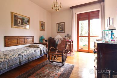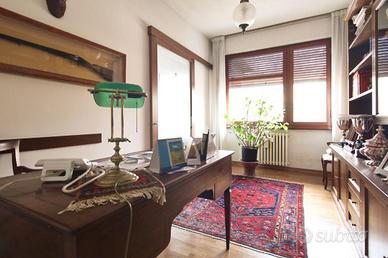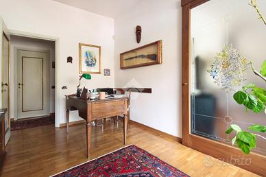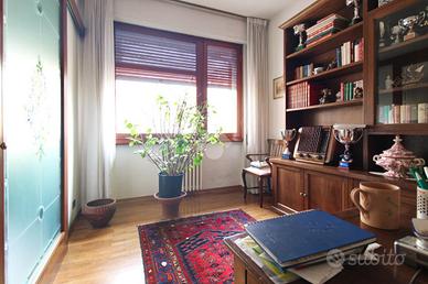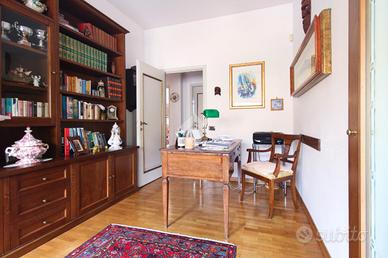 L'immobile misura circa 140 mq calpestabili e presenta un'ottima divisione degli ambienti. L'ampio ingresso conduce sulla sinistra al soggiorno doppio di quasi 35 mq, con accesso al balcone che affaccia sulla piazza, e sulla destra alla cucina abitabile dotata di terrazza tergale. Nella zona notte si trovano due camere da letto matrimoniali dotate di armadio a muro, un grande studio collegato al soggiorno tramite una porta a vetri scorrevole e utilizzabile come terza camera, due bagni entrambi finestrati e un comodo ripostiglio.
