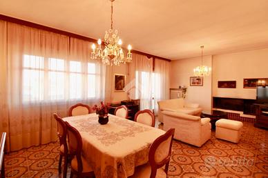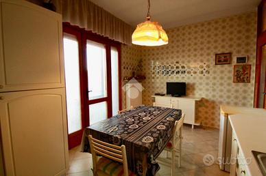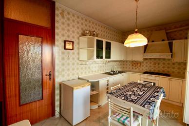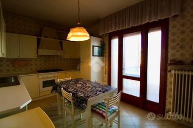 Sulla sinistra c'è la cucina, separata dagli altri ambienti, abitabile e con accesso al terrazzo. Andando oltre la cucina, sempre sulla sinistra, abbiamo l'ampio soggiorno con tavolo per sei persone, armadiatura/libreria, mobile credenza, divano, poltrona, ed un camino a scaldare l'ambiente, ed anch'esso collegato direttamente con un terrazzo abitabile.