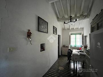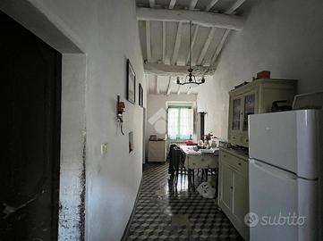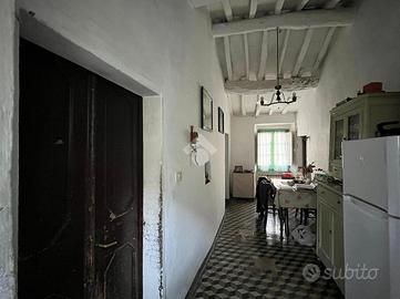 L'attuale composizione interna vede al piano primo un ingresso con la sala da pranzo, una cucina abitabile, due camere da letto, un bagno finestrato e un comodo ripostiglio; al piano terra invece troviamo un'unico ambiente adibito a magazzino/ deposito agricolo.