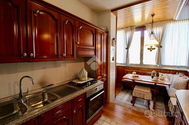 Salendo al primo piano ci troviamo di fronte all'ingresso dell'immobile oggetto di vendita. Entrando nell'appartamento, sulla destra, incontriamo la cucina completa con tavolo per sei persona e completa di ogni arredamento, separata dalla zona giorno.