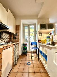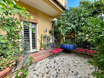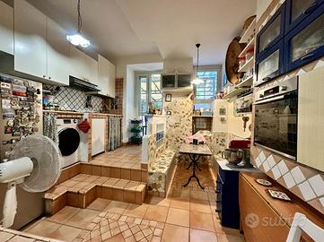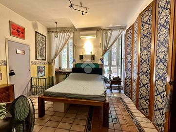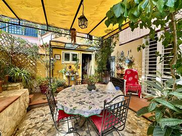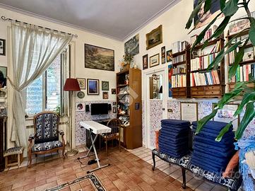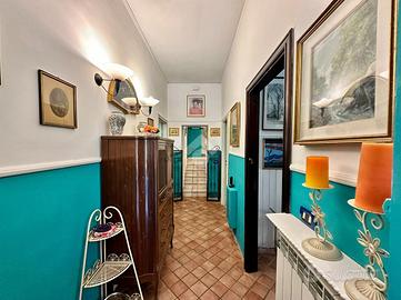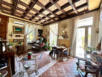 E' possibile accedere alla proprietà da tre ingressi tutti indipendenti. La superficie interna è suddivisa in modo regolare: dall'ingresso principale, quindi dal giardino, si accede in un ampio salone doppio illuminato da due balconi ed una finestra sul verde, a cui si affianca una terza camera studio anch'essa con balcone e finestra, che completa la zona di rappresentanza.Il corridoio disimpegna le tre camere da letto di cui due esposte a sud. Tutte le camere affacciano sul giardino a cui si può accedere direttamente quasi da ogni ambiente. Dalla cucina abitabile infatti è facilissimo raggiungere il gazebo del lato nord del giardino e pranzare all'aperto. Qui fuori c'è un utilissimo lavabo e gli attacchi per un'eventuale seconda lavatrice esterna. Dalla camera da letto padronale, si accede inoltre, tramite scala a chiocciola, ad una zona sottoposta regolarmente condonata, che consta di un antibagno, di un bagno con vasca e doccia e di un'ampia zona originariamente utilizzata come tavernetta oggi..