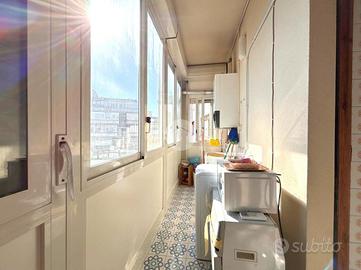 Posto al quinto piano, l'appartamento si distingue per la luminosità degli ambienti e per una disposizione interna funzionale e ben organizzata. L'ingresso conduce a un elegante salone doppio, perfetto per accogliere ospiti o creare una zona living ampia e conviviale. La cucina, non abitabile ma ben separata, garantisce funzionalità e praticità. La zona giorno è completata da un doppio servizio. Un comodo corridoio accompagna alla zona notte, composta da due camere da letto ben proporzionate e da una terrazza di collegamento.