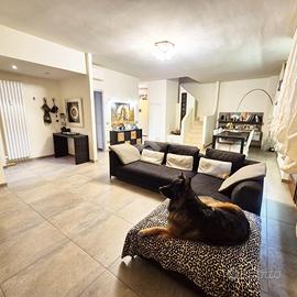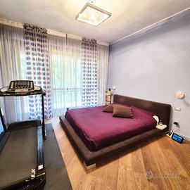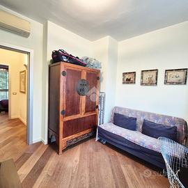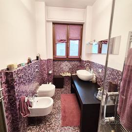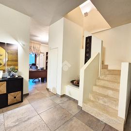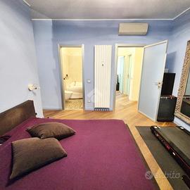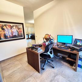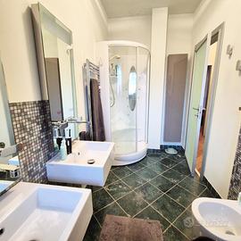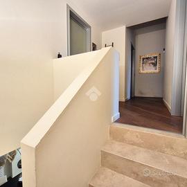 Il bagno, rivestito in mosaico Bisazza e con calorifero termo-arredo, dispone di box doccia Jacuzzi. Il piano è corredato anche da un'ampio studio/office. Al livello superiore si accede da un elegante scala rivestita in marmo travertino romano classico, in falda levigata. Qui abbiamo la camera padronale con spazio cabina armadio, e con affaccio al terrazzo. E' munita di un ampio bagno con pavimentazione in resina (Rivestone Brenta) e con vasca idromassaggio angolare Jacuzzi.