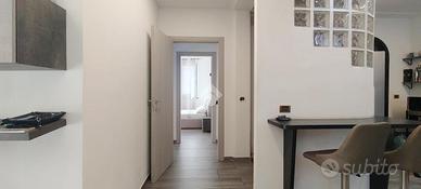 A questo piano, il terzo, entriamo da subito nel disimpegno, che da una parte ci fa entrare nello studio (volendo da utilizzare come ulteriore cameretta) e proseguendo ci sposta nella zona giorno, un'area di circa 40 mq, strutturata in maniera molto intelligente, dove si divide la parte relax-soggiorno e la parte cucina, strutturata anche con un angolo colazione con penisola; quì troviamo anche il primo balcone, con affaccio diretto su Piazza Mameli e sulla Chiesa di Santo Stefano e che fornisce una buona luminosità alla stanza.