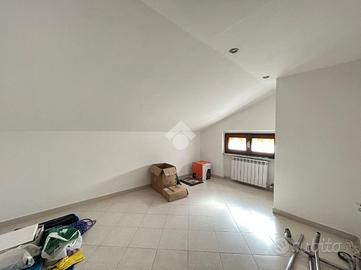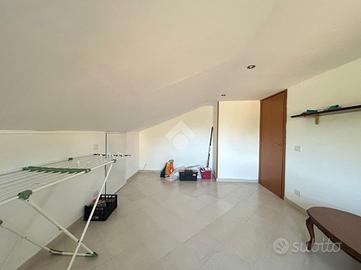 Internamente l'immobile è così composto: al primo piano l'ingresso si apre su un luminoso e spazioso soggiorno con camino, una cucina abitabile con accesso al balcone, due camere da letto matrimoniali, un ripostiglio e un bagno con finestra e box doccia. Attraverso una comoda scala interna si accede al piano superiore mansardato, dove troviamo ulteriori due spaziosi locali, un secondo bagno con finestra e box doccia e un sottotetto sfruttabile.